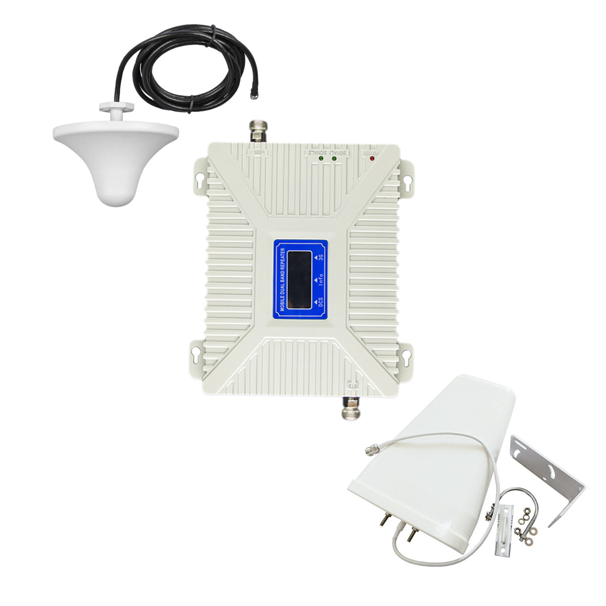 Работа прибора обеспечивается электрической сетью – 220В, блок питания входит в комплект к каждому устройству. Для полноценной корректной работы репитера необходимо подключить к нему 2 антенны (внутреннюю и наружную). Цель внутренней антенны – раздача сигнала внутри помещения, в то время как основная миссия наружной — усилить или ретранслировать сигнал с улицы. Если с внутренней антенной все просто, ее достаточно разместить в необходимом для Вас помещении, то с наружной, как правило, возникают вопросы. Но в случае данной модели репитера трудностей с настройкой у Вас не появится! Благодаря дисплею, Вы можете видеть коэффициент усиления каждой из работающих частот. Поэтому наружную антенну достаточно просто направлять в разные стороны до тех пор, пока не найдете достаточное усиление частот, ориентируясь на показатели дисплея.